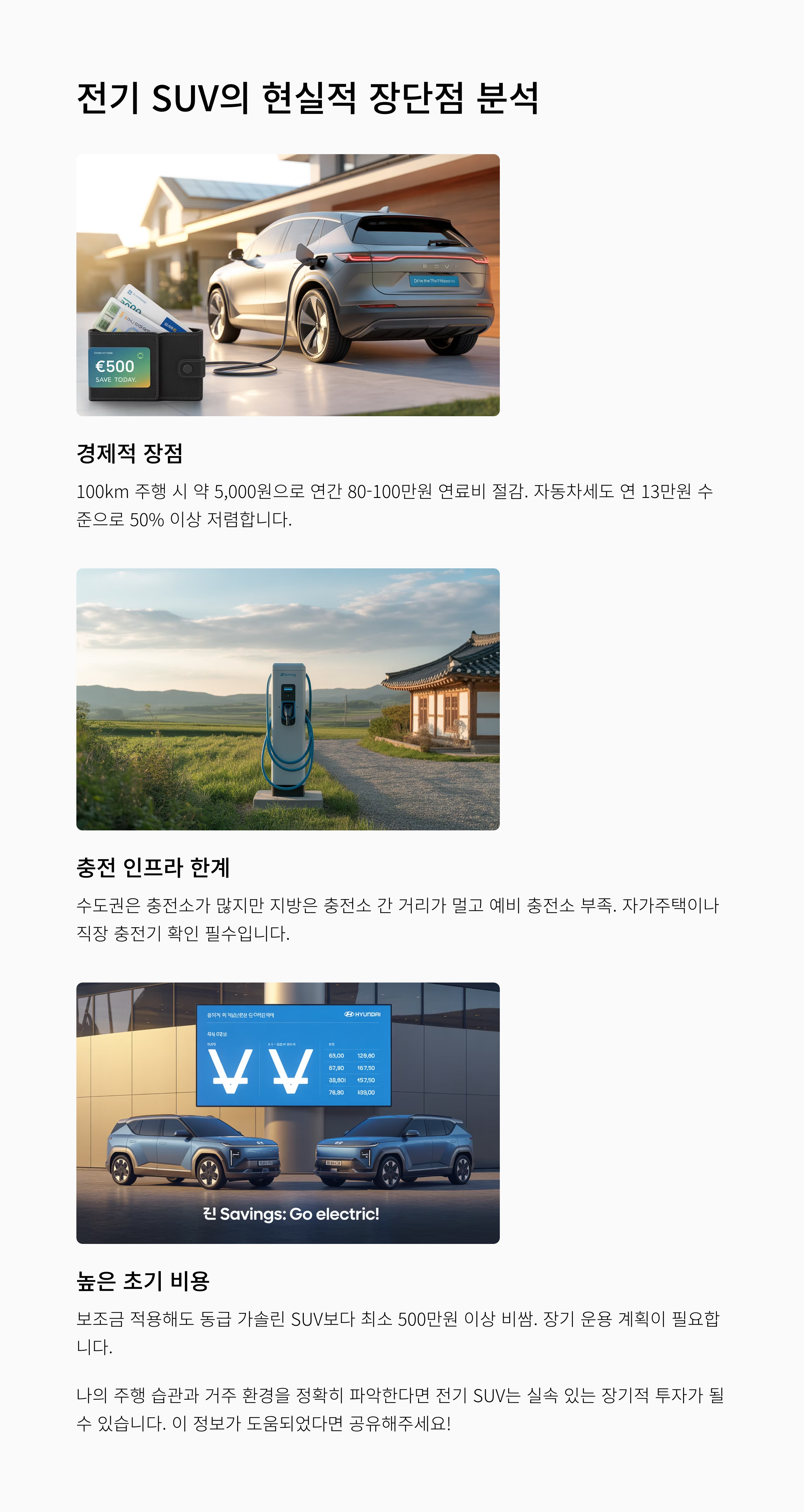 전기 SUV의 실제 장점과 단점은 무엇일까요? 충전 환경, 유지비, 공간 활용도, 초기 비용 등 구매 전에 꼭 확인해야 할 핵심 포인트를 정리한 완벽 가이드를 제공합니다.